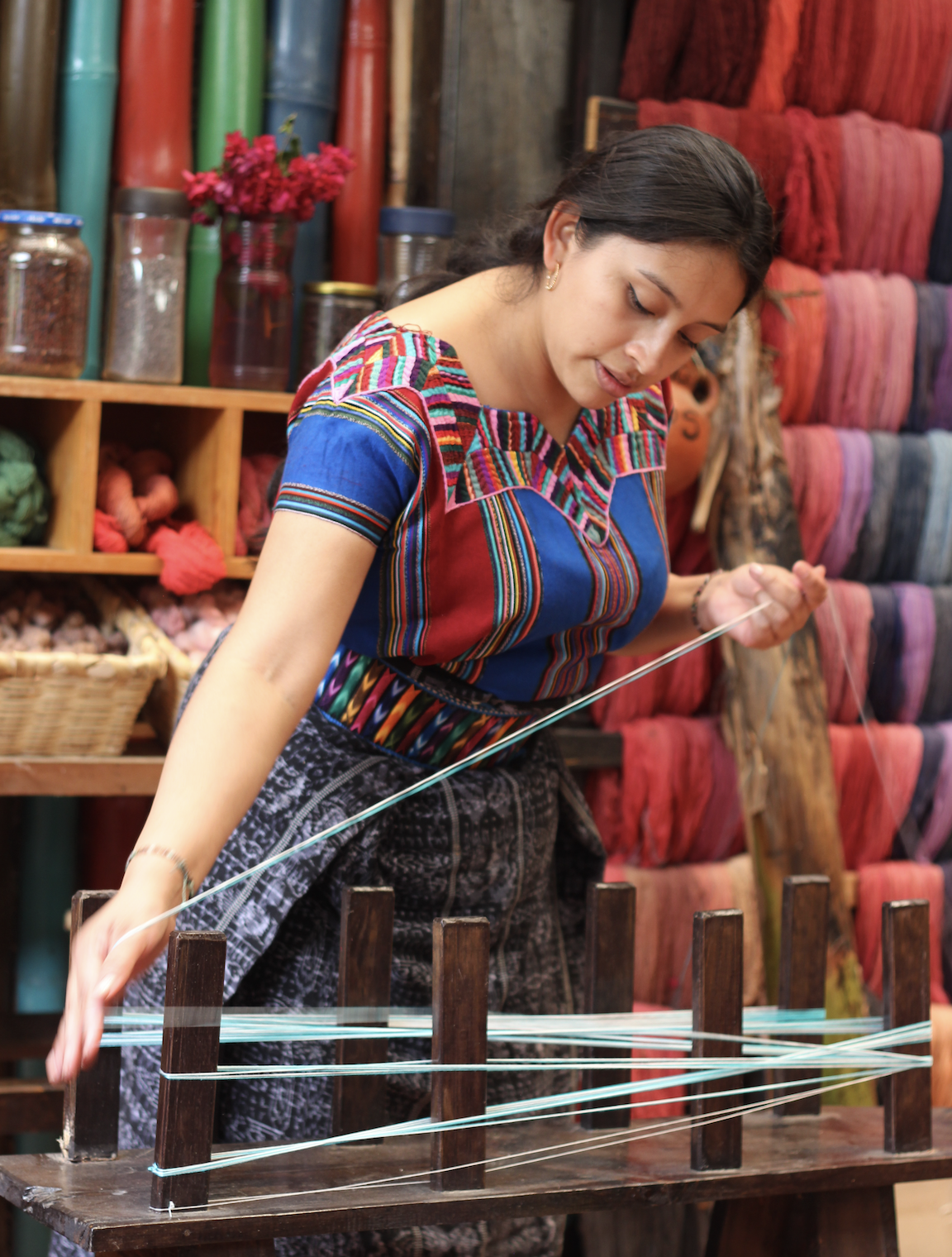 The village of San Juan la Laguna is nestled on the shores of Lake Atitlan in the heart of the Mayan region and present day Guatemala. Textile culture is still vibrant in this part of the world. Towns abound with brilliantly coloured, hand-woven fabrics, and many Guatemalan women still wear their traditional dress. San Juan, in particular, is filled with artisans and collectives. Also a common tourist destination, the streets are lined with signs inviting visitors inside for demonstrations on weaving and natural dyeing.